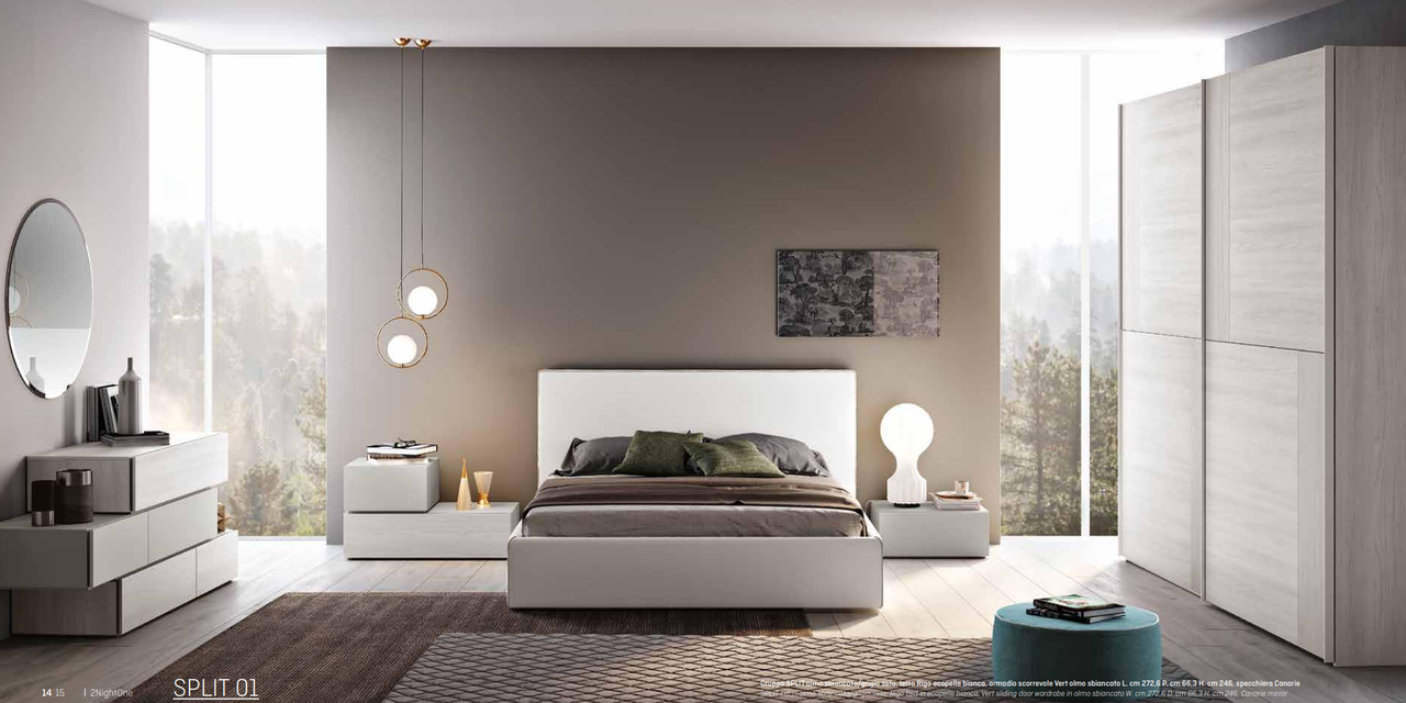 Сучасна спальня, що характеризуються вишуканими контрастами та елегантними лініями. Нові фактури та кольори (коньячний горіх, вибілений в'яз, конопляна модрина та шовковисто-сірий), прості або особливі, м'які чи строгі лінії та геометричні форми характеризують цю модель. Шафи з розпашними або розсувними дверима та нові ліжка, як дерев'яні, так і м'які, надають кожній композиції концентрацію дизайну, функціональності та досконалості форми. Вибір дерева та такі природні геометричні лінії роблять цю модель джерелом релаксації.